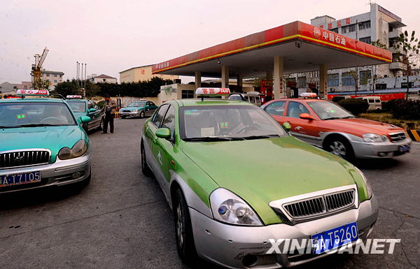几辆出租车在杭州一处加油站外等待加油(12月13日摄)。近日,杭州市委、市政府公布包括补贴、减税等在内的13条举措,促进出租车行业健康稳定发展,为出租车司机减负。