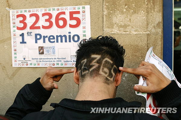 12月22日,西班牙圣诞彩票头奖获得者之一的胡安·费尔南德斯在巴塞罗那展示体现中奖号码32365的新发型。有“全球最有钱”彩票之称的西班牙圣诞彩票当日开出头奖,中奖者分布在阿里坎特、索利亚、巴塞罗那及马德里等8个省份。西班牙今年圣诞彩票的销售额为33.15亿欧元,其中70%作为奖金返还。新华社/路透