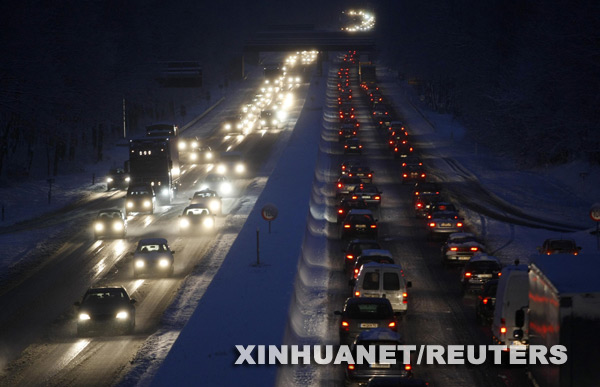 1月5日,在德国波鸿,车辆在公路上缓慢行驶。 当日,德国多数地区降下大雪,积雪厚达20厘米。大雪导致地面交通瘫痪,有些地方车辆排队长达30公里。勃兰登堡州一夜之间发生100余起交通事故,造成一人死亡多人受伤。新华社/路透
