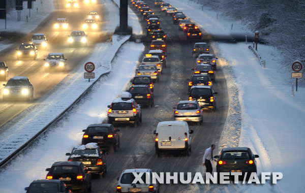 1月5日,在德国西部的埃森,车辆在一条公路上排起了长龙。当天,欧洲多个国家普降大雪。新华社/法新