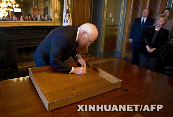 1月12日,美国副总统切尼在艾森豪威尔行政办公楼的副总统办公桌抽屉上签下了自己的名字。新华社/法新