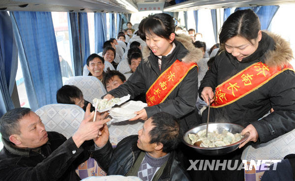 1月14日,交运集团工作人员为农民工送“春运饺子”。当日,山东交运集团开通的“民工返乡直通车”来到济南一建筑工地,接送来自贵州安龙镇的50多名农民工兄弟返乡过年。在出发仪式上,工作人员为他们送上了对联、福字和热气腾腾的“春运饺子”。