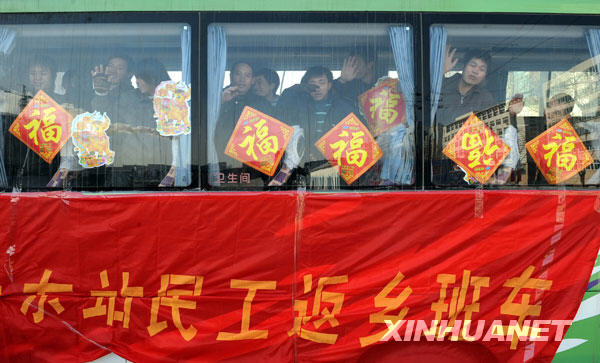 1月14日,农民工们登上“民工返乡直通车”。