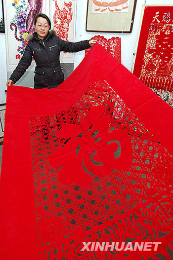 1月18日,山东淄博周村的剪纸艺人刘敏燕展示巨幅剪纸。新春佳节临近,淄博市周村古城剪纸艺人刘敏燕制作的传统民俗图案剪纸受到顾客欢迎。