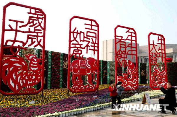 1月20日,温州市民在大型“剪纸花窗”造型景观前拍照。近日,一组4米高的“剪纸花窗”造型景观亮相浙江省温州市世纪广场,为温州街头增添喜庆年味。