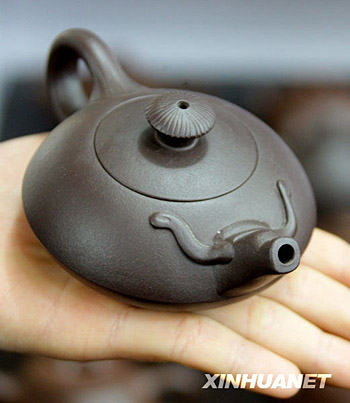 这是1月30日在北京大栅栏老字号广德楼拍摄的一款牛头紫砂小壶,这款壶造型生动可爱,受到顾客青睐。