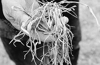 | 2月1日,河南省中牟县白沙镇岗李村农民查看严重干旱的麦苗。新华社记者