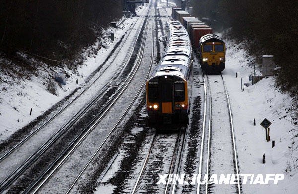 2月3日,在英国汉普郡,一列客车在布满积雪的铁道上行驶。英国行业协会当日公布的一份调查数据显示,大雪给英国造成的经济损失可能超过10亿美元。如果降雪持续,这一数字可能继续上升,使本已陷入衰退的英国经济雪上加霜。新华社/法新