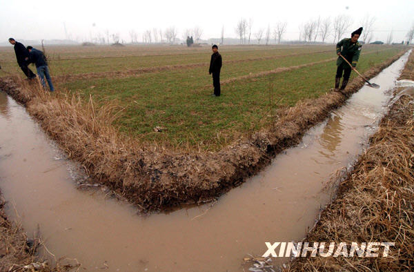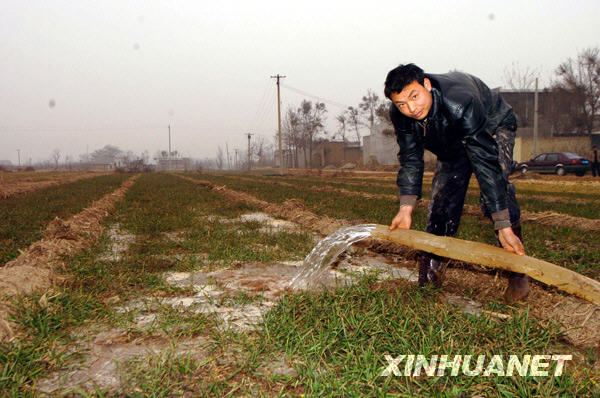 2月4日,陕西省蒲城县洛惠渠陈庄管理站专业浇地队员马春成(右一)正在田间实施灌溉。面对日趋严重的旱情,陕西渭南要求全市各灌区动用一切水利设施,挖掘水源潜力,扩大灌溉面积。渭南市是陕西小麦主产区之一,目前已经形成百日连旱,全市各类农作物受旱面积达到380万亩,其中重旱灾20万亩。 |