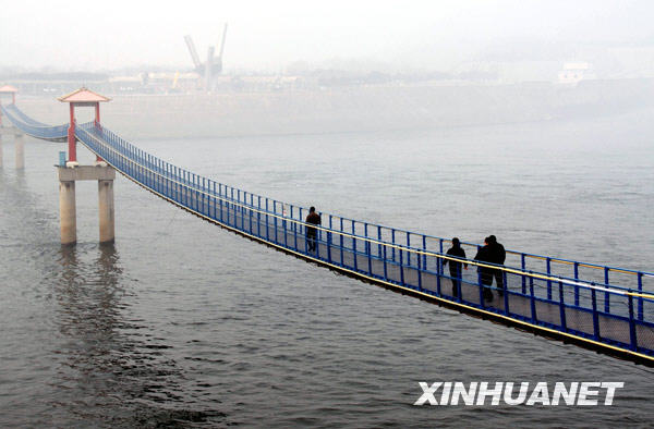 2月5日,几名游客从黄河小浪底大坝出水口的铁索桥上走过。鉴于黄河流域多个省份同时发生严重干旱,黄河防总进一步提升预警级别,从2月3日起黄河流域区域干旱由黄色预警升级为橙色预警,启动二级应急响应。小浪底水库日均出库流量也加大至每秒600立方米,以保障沿黄地区抗旱用水。