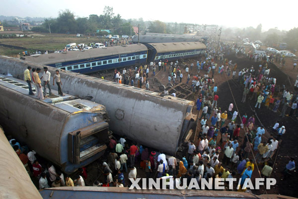 2月14日,在印度奥里萨邦首府布巴内什瓦尔附近的杰吉浦尔,人们聚集在火车出轨事故现场。据印度亚洲通讯社当天报道,一趟从加尔各答开往马德拉斯的高速列车13日在杰吉浦尔发生出轨事故,目前已造成至少15人死亡,150人受伤,事故原因正在调查中。 新华社/法新
