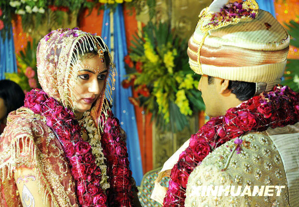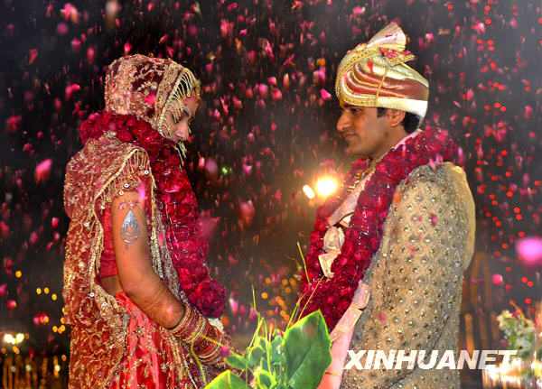 2月16日,在印度首都新德里郊外举行的印度教婚礼仪式上,新娘深情地凝望新郎。印度青年男女的传统婚礼仪式以其华丽的服饰、盛大的场面、热情的歌舞等特色闻名。