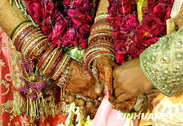 2月16日,在印度首都新德里郊外举行的印度教婚礼仪式上,新郎新娘十指相扣。