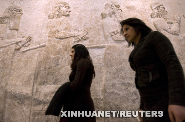 2月23日,在位于伊拉克首都巴格达的伊拉克国家博物馆,参观者从亚述时代的雕刻作品前走过。当天,伊拉克战争后因遭到大肆抢掠而关闭近6年的伊拉克国家博物馆在巴格达重新开放,展出了数千件珍贵文物,其中很多是从国外归还的被抢掠文物。伊拉克国家博物馆始建于20世纪20年代,是伊拉克最早建立、藏品最丰富的博物馆,被联合国教科文组织列为世界第11大博物馆。新华社/路透
