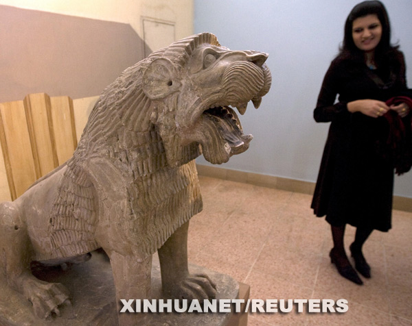 2月23日,在位于伊拉克首都巴格达的伊拉克国家博物馆,一名女子欣赏一座巴比伦时期的狮子雕塑。新华社/路透