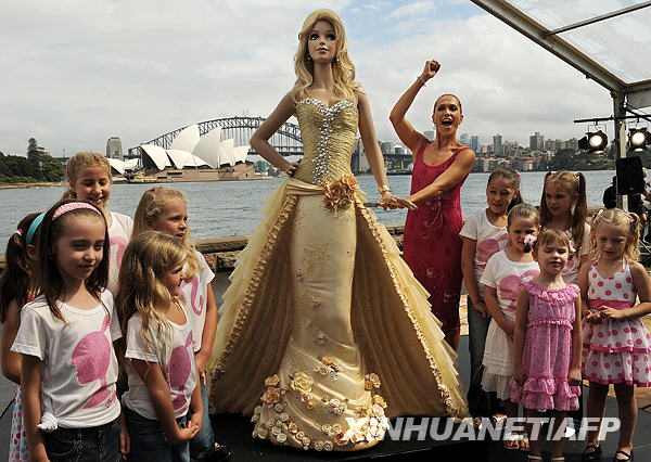 3月9日,在澳大利亚悉尼,模特埃丽卡·海娜茨准备切下高达2.1米的“芭比娃娃”巧克力蛋糕,以庆祝芭比娃娃50岁生日。当日,玩具芭比娃娃迎来50岁生日。芭比娃娃是美国人——美泰玩具公司创办人露丝·汉德勒于1959年设计创造的,以其女儿芭芭拉的昵称命名。新华社/法新