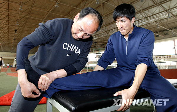 3月10日,孙海平教练对刘翔(右)受伤的右脚进行训练。 当日,在美国手术及康复训练了三个月的刘翔,在上海进行了回国后的首次公开训练。
