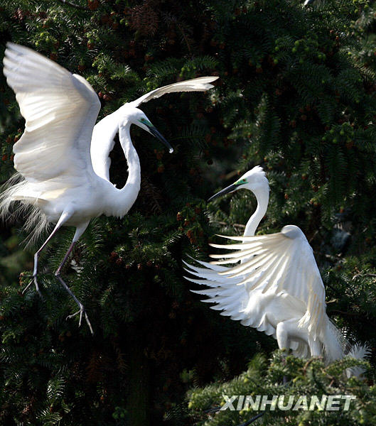 4月6日,一对白鹭在林中嬉戏。新华社发(沈俊峰 摄)