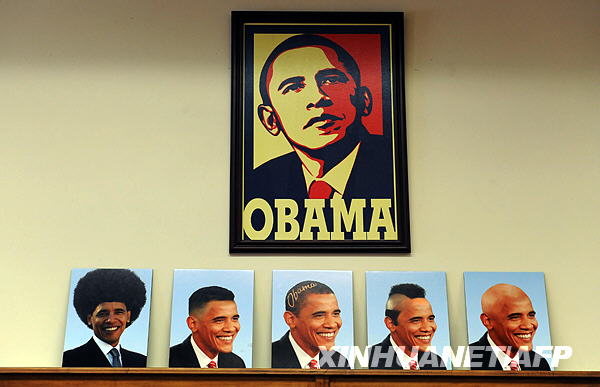 5月4日,在美国洛杉矶的一家理发店内摆放着印有美国总统奥巴马不同发型头像的图像。这家理发店为了吸引顾客,别出心裁地通过电脑制作出一些奥巴马不同发型的头像。新华社/法新
