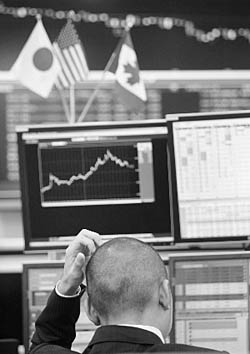| 29日,一名交易员在日本东京一家外汇交易所内工作