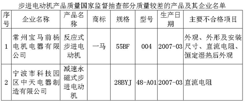 为了促进步进电动机行业健康发展,国家质检总局近日组织了对步进电动机产品质量进行国家监督抽查,共抽查了北京、上海、江苏、浙江、安徽、湖南、广东等七个省、直辖市40家企业生产的40种产品(不涉及出口产品),产品实物质量合格率为87.5%。 步进电动机广泛应用于数控机床、加工机械、仪表和办公自动化设备及家用电器控制系统中。常用的步进电动机包括反应式步进电动机、永磁式步进电动机、混合式步进电动机等。此次抽查依据各项国家标准及相关产品标准的要求,对步进电动机产品的铭牌及出线标记、外观、外形及安装尺寸、直流电阻、旋转方向、绝缘电阻、绝缘介电强度、牵入转矩、保持转矩、重量、温升、噪声、摩擦力矩、输出轴机械强度、引出线强度、摩擦耐久、空载起动频率、空载运行频率、低温、高温、冲击、恒定湿热等项目进行了检验。 抽查中发现的主要质量问题有,首先,电机基本运行性能指标不合格。有个别产品空载运行频率、直流电阻达不到标准规定的要求。电机基本运行性能指标不合格,将直接影响到整机系统的响应能力,关系到驱动控制系统的整体性能。 其次,个别产品电机的外形尺寸不合格。电机是属于一种机电一体的元器件,通常是应用于各种设备中作为执行元件,尺寸的误差会导致不能精确地配套安装从而影响整机的质量。