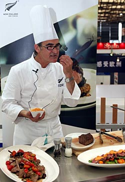 | 近日在上海举行的中国国际食品饮料和酒店用品展上,来自23个国家和地区的800多家参展商展示了各类进口鲜果、罐头食品、饮料等产品。图为来自新西兰的厨师在向观众展示新西兰美食。本报记者