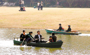 春天来了,游客在松江方塔公园内荡起小舟。沈家善 摄
