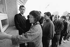 “上午3500,下午1500”,记者看到,在博物馆门前发票处的窗口上,醒目地贴着每日参观票的发放限额。当日下午两点半左右,博物馆“下半场”开始,参观者排着整齐的队伍有序进场,当门前还有三四十人时,发票暂停。保安解释说:“3点钟再发,控制一下人数。”排队的人们都心平气和地等着,或翻看报纸,或三五成群地聊天。
