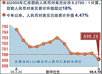 再从外因看,美元加速贬值,也推动了人民币汇率较快升值。受次贷危机等因素影响,国际金融市场上美元不断走贬。今年一季度,美元对日元最多时贬值13.3%,对欧元最多时贬值7.5%。由于人民币汇率参考一篮子货币进行调节,在一篮子货币中,大头还是美元。美元持续贬值,人民币就会不断升值。