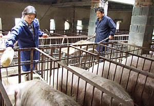 | 8月15日,安徽省淮北市烈山区古饶镇一家养猪场的养殖户正在给育肥猪喂食。为提高养殖户的积极性,尽快保证生猪市场供应,国家财政从2007年起,实施能繁母猪补贴政策,按每头50元的补贴标准,对饲养能繁母猪的养殖户(场)给予补贴。本报资料照片 | 肉价飙升并未调动养殖热情