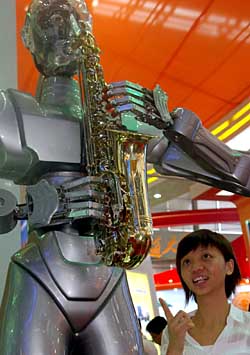 | 娱乐机器人在高交会上吹奏萨克斯管。新华社记者 周文杰