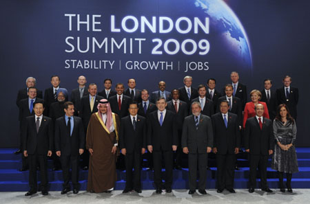 4月2日,国家主席胡锦涛在伦敦出席二十国集团领导人第二次金融峰会。这是与会各国领导人及有关国际组织负责人集体合影。新华社记者:李学仁 摄
