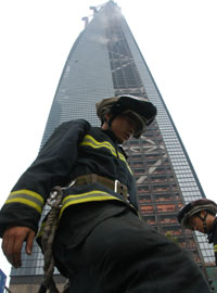 8月14日,消防员在发生火灾的上海环球金融中心工地灭火抢险。