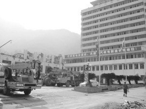 眼前的一切让记者感到触目惊心!厂门口的东汽广场上,密密麻麻地布满了救灾帐篷,一直蔓延到厂区内。马路边停满了绿色、白色和黄色的救灾车。位于对面的绵竹市第三医院已经基本上变成了一摊废墟,一台起重机和一群解放军正在紧张地搜救被掩埋的人。救护车和警车不时发出凄厉的警报声,划破了这个曾经兴旺的小镇的宁静。 进入建造在山脚下的东汽厂区,一幅幅场面更让人揪心!大部分厂房都已遭受严重损毁,随处可见倒塌的墙体和散落一地的玻璃碎片。损毁最严重的焊接和轴承车间,整个车间顶棚已经完全坍塌下来,只剩下一个岌岌可危的框架。停在车间门口的几部小轿车被倒下的墙体砸成了柿子饼。 一位工人言语有些哽咽地对记者说,当时正在上班,很多工人在车间里,有些现在还埋在里面呢。由于车间目前有随时倒塌的可能,这给搜救带来了巨大的麻烦。 位于厂区办公大楼前的图书馆,已经找不到楼顶,垮塌得只剩下两层半。十几层的办公大楼虽在地震中幸免于难,但外墙上已可以看到明显的裂痕。办公大楼前旗杆上悬挂着的东汽厂旗,哀怨地挂在旗杆一半处。